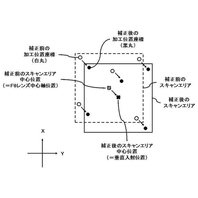 【解決手段】スキャンエリアの中心位置とレーザ光の垂直入射位置のずれ量に基づいて補正した加工位置座標に基づいて、テーブル駆動部及びガルバノ駆動部を制御することにより、スキャンエリアを該スキャンエリアの中心位置にレーザ光が垂直に入射することとなる位置に位置決めし、ガルバノミラーを前記補正した加工位置座標にレーザ光が入射するように位置決めする。