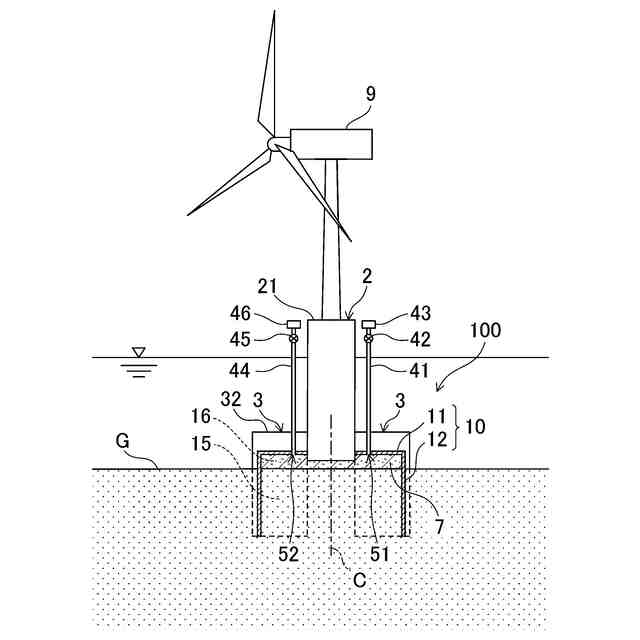 図1は、サクション基礎100が設置された状態を模式的に示した説明図である。サクション基礎100は、水上又は水中に上部構造物を設置するための基礎であり、水中の地盤Gに沈設される。図1の例では、サクション基礎100は、上部構造物を水上に設置するための基礎である。上部構造物は、例えば風車9である。サクション基礎100は、基礎本体10と、上下方向に延びる柱状のベース2と、ベース2に連結された複数の縦壁3とを備えている。本開示では、2つの部材が連結されているとは、2つの部材が直接連結されている場合のみならず、2つの部材が別の部材を介して間接的に連結されている場合も含む。