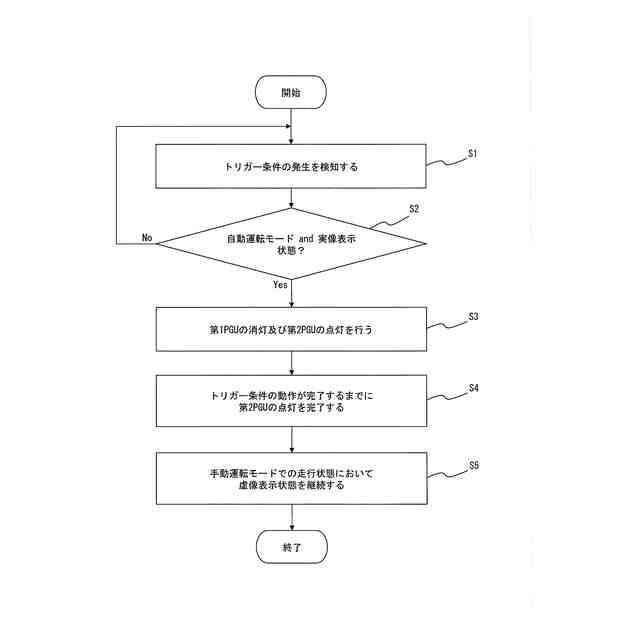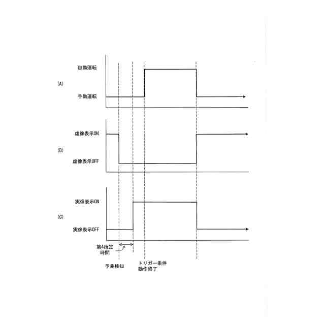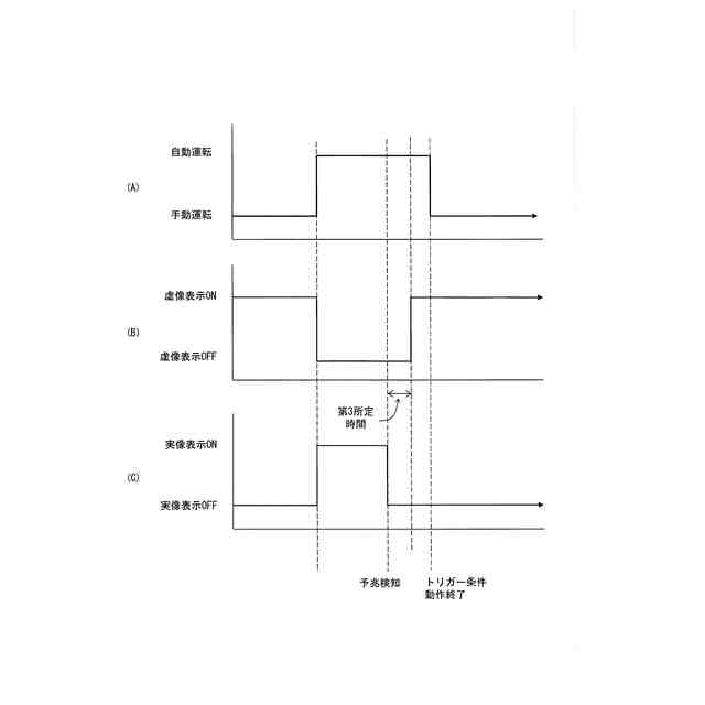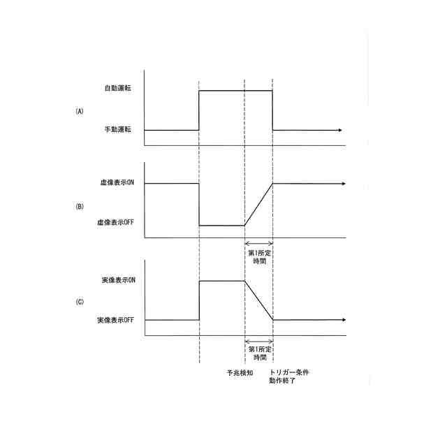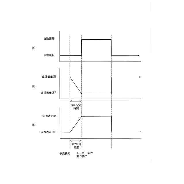 本発明によれば、トリガー条件の発生により実像と虚像との間を切り替えるのではなく、トリガー条件の発生に先んじて事前に実像と虚像との間を切り替えることにより、搭乗者の視線を移すなどの準備行動に適合した最適な制御を行うことができる。また、搭乗者に準備行動自体を促すこともできる。