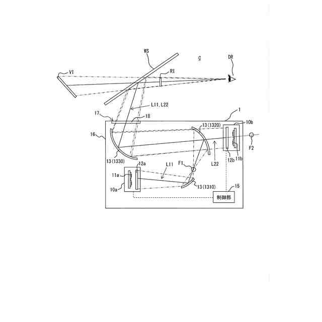 図1において、HUD装置1は、例えば可視波長域の光を出す第1光源11a、及び、当該第1光源11aが出射した光を透過させると共に、運転者DR(搭乗者)の前方に結像される表示像の実像RIを表示する第1表示部12aを有する第1PGU10aと、例えば可視波長域の光を出す第2光源11b、及び、当該第2光源11bが出射した光を透過させると共に、運転者DRの前方に結像される表示像の虚像VIを表示する第2表示部12bを有する第2PGU10bと、第1表示部12aに表示された表示像を表す第1表示光L11や第2表示部12bに表示された表示像を表す第2表示光L22をウィンドウシールドWS(透光部材)に向けて反射する反射部13と、第1表示部12a及び第2表示部12bにおける表示内容の制御、及び、第1PGU10a及び第2PGU10bの切り替え制御等を行う制御部15とを備え、これらが筐体16に収容される。筐体16には第1表示光L11及び第2表示光L22が射出される開口部17(射出口)が設けられ、当該開口部17には内部を保護するためのカバーガラス18が配置される。運転者DRは搭乗者の一例、ウィンドウシールドWSは投光部材の一例、開口部17は射出口の一例である。
