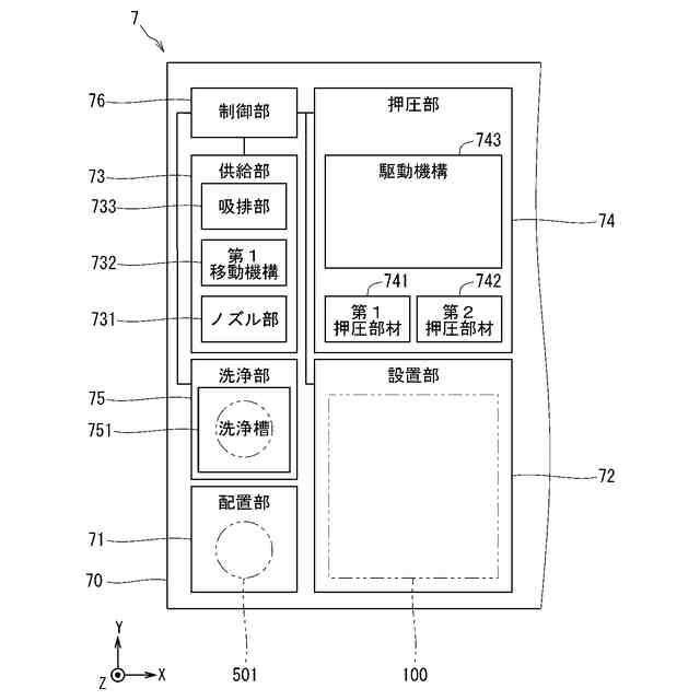 配置部と、設置部と、供給部と、押圧部と、洗浄槽を含む洗浄部と、制御部と、を備え、