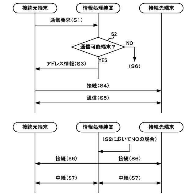 【解決手段】情報処理装置は、情報処理サービスの利用者端末を識別するための情報と、サービス可否情報とが関連付けられた情報処理サービスデータを記憶する記憶部と、接続元端末から、接続元端末識別情報と接続先端末識別情報とを含む通信要求を受け付ける受付部と、記憶部において通信要求に含まれる接続元端末識別情報に関連付けて記憶されているサービス可否情報がネットワークを介して通信することが可能な端末であることを示す場合、アドレス情報を接続元端末に送信する送信部と、記憶部において通信要求に含まれる接続元端末識別情報に関連付けて記憶されているサービス可否情報がネットワークを介して通信することが可能な端末ではないことを示す場合、アドレス情報に基づいて、接続元端末と接続先端末との間における通信を中継する中継部と、を有する。