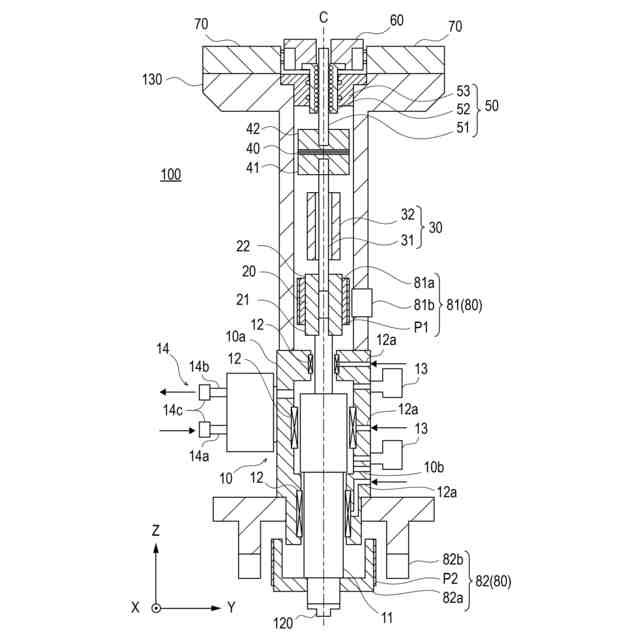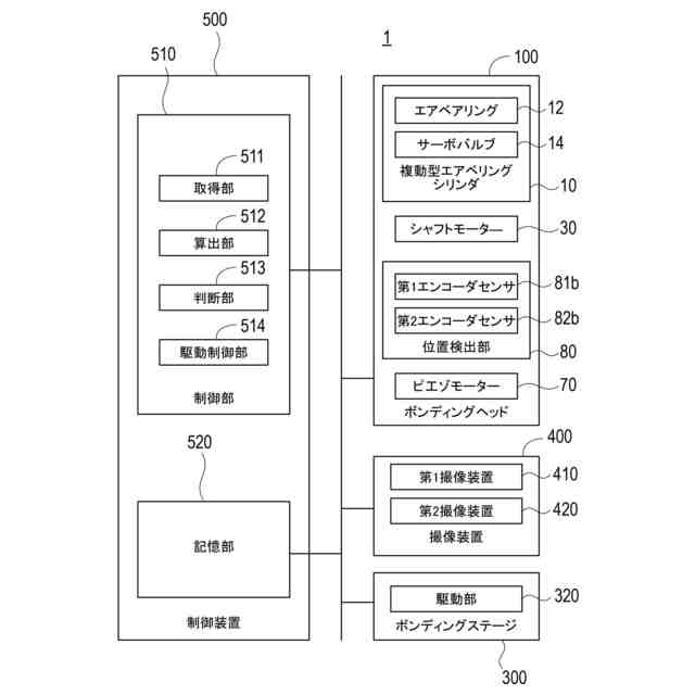 【解決手段】ボンディングヘッド100は、シリンダロッド11を垂直方向に第1垂直移動量だけ移動させる複動型エアベアリングシリンダ10と、シリンダロッド11と同軸上に配置され第1エンコーダパターン21を有する第1スケール22と、第1エンコーダパターン21の位置を読み取る第1エンコーダセンサ23と、シリンダロッド11と同軸上に配置され第2エンコーダパターン24を有する第2スケール25と、第2エンコーダパターン24の位置を読み取る第2エンコーダセンサ26と、シリンダロッド11と同軸上に配置され第1エンコーダセンサ23の読み取り結果に基づきシリンダロッド11を垂直方向に第2垂直移動量だけ移動させるシャフトモーター30と、シリンダロッド11と同軸上に配置されシリンダロッド11を回転方向に回転移動量だけ移動させるピエゾモーター40と、を備える。