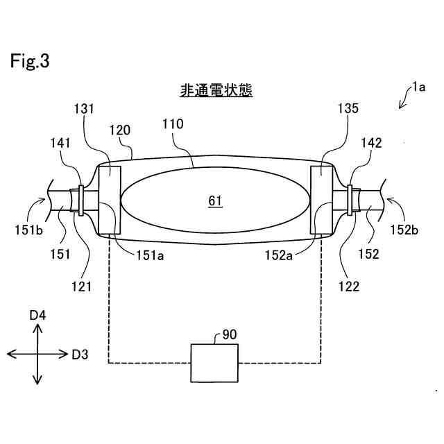 袋110は、グリース61を収容した状態で密閉されている。袋110は、グリース61の流動に応じて変形する。袋110は、伸縮性を有していてもよく、伸縮性を有していなくてもよい。本実施形態では、袋110は、固定されることなく、編組スリーブ120の内部において、第1電磁石131と第2電磁石132との間に配置されている。他の実施形態では、袋110は、軸部151,152などの任意の部材に固定されていてもよい。