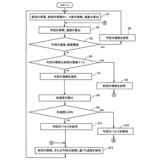 上記目的を達成するために、この発明の第1の局面による速度検出装置は、被検出物の速度に応じて発信されるパルスの周期に基づいて被検出物の速度を算出する制御部を備え、制御部は、今回のパルスの周期が、前回のパルスの周期の1より大きい所定の倍率以上である場合、パルスが欠落していると判定し、前回のパルスの周期に基づいて、被検出物の速度を算出し、前回のパルスの周期と今回のパルスの周期とに基づく加速度が、所定の加速度閾値以上である場合、パルスが過剰に入力されていると判定し、今回のパルスを無視する。
