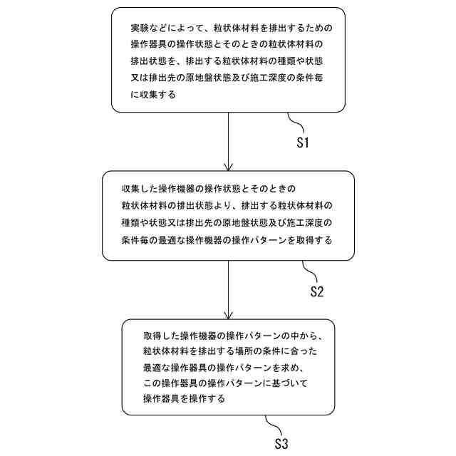 収集した操作器具の操作状態とそのときの粒状体材料の排出状態より、排出する粒状体材料の種類や状態又は排出先の原地盤状態及び施工深度の条件毎の最適な操作器具の操作パターンを取得する第二の工程と、