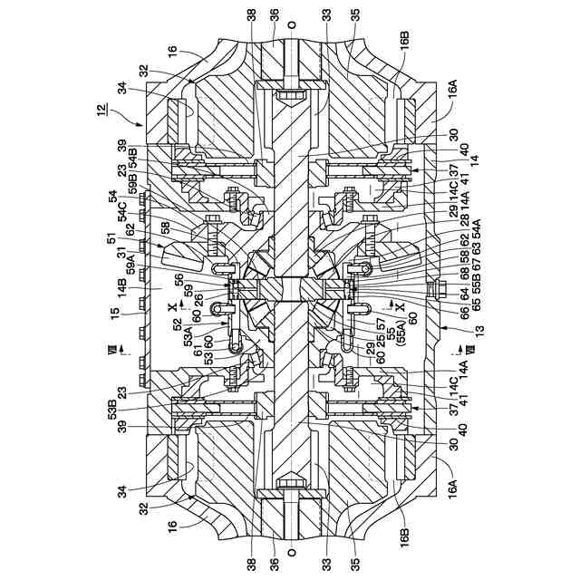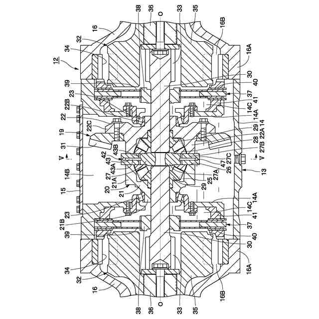また、デファレンシャル機構は、エンジン、電動モータ等の駆動源によって左右方向に延びた軸線を中心にして正転方向(前進方向)または逆転方向(後進方向)に回転する中空なデファレンシャルボディと、デファレンシャルボディ内に軸線を中心にして回転可能に設けられ、放射状に延びる複数本の軸部を有するスパイダと、複数本の軸部に回転可能に取り付けられた複数個のピニオンギヤと、複数個のピニオンギヤを挟むようにデファレンシャルボディ内に軸線を中心にして回転可能に設けられ、複数個のピニオンギヤに噛合すると共に一対のアクスルシャフトに接続された一対のサイドギヤと、を備えている。