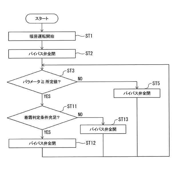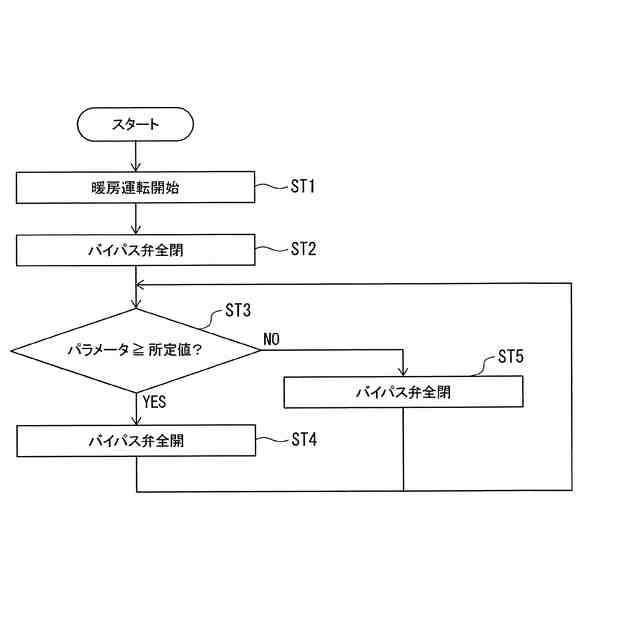 【解決手段】圧縮機1と、室内熱交換器2と、減圧手段3と、室外熱交換器4とが冷媒配管で順次接続され、冷媒が循環する冷媒回路Cと、室内熱交換器2と減圧手段3との間を流れる冷媒と蒸発器と圧縮機との間を流れる冷媒とが熱交換する中間熱交換器6と、中間熱交換器6をバイパスするバイパス回路Bと、バイパス回路Bに設けられるバイパス弁B1と、圧縮機1と、減圧手段3と、バイパス弁B1と、を制御する制御装置8と、を備え、制御装置8は、暖房運転時に、中間熱交換器6に流入する高圧の冷媒の過冷却度と相関関係があるパラメータが、予め設定された所定値以上であると判定した場合に、バイパス弁B1を開く制御を行う。