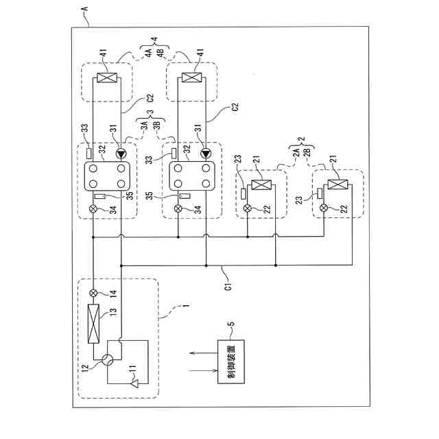 【解決手段】圧縮機11と、一次室内機2と、一次室内機2と並列に接続される中継ユニット3と、一次室内機2及び中継ユニット3のそれぞれが備える減圧機構22,34と、が冷媒配管で接続され一次冷媒が循環する一次冷媒回路C1と、中継ユニット3に接続される二次室内機4と、二次室内機4と循環ポンプ31とが冷媒配管で接続され二次冷媒が循環する二次冷媒回路C2と、圧縮機11及び減圧機構22,34を制御する制御装置5と、を備え、制御装置5は、一次室内機2及び中継ユニット3が暖房運転を行っている場合に、着霜判定条件を充足したと判定し除霜運転を開始する前に、圧縮機11の回転数を上昇させて、一次室内機2の暖房運転よりも中継ユニット3の暖房運転を優先するプレヒート運転を実施する。