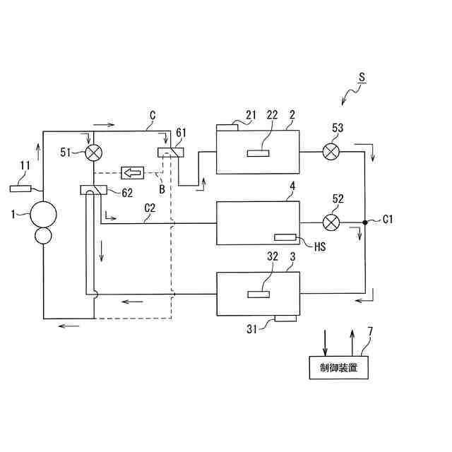 【解決手段】圧縮機1と、室内熱交換器2と、室外熱交換器3と、蓄熱材と冷媒とを熱交換する蓄熱熱交換器4と、蓄熱側膨張弁51と、室内側膨張弁53と、を有する冷媒回路Cと、蓄熱側膨張弁51と室内側膨張弁53とを制御する制御装置7と、を備え、制御装置7は、蓄熱側膨張弁51を閉じることで冷媒が室内熱交換器2に流入する暖房運転と、蓄熱側膨張弁51を開くことで冷媒の一部が蓄熱熱交換器4に流入する蓄熱暖房運転と、を切り換える制御を行うとともに、暖房運転から蓄熱暖房運転へと切り換えるとき、室内側膨張弁53の開度を絞る制御を行い、蓄熱暖房運転から暖房運転へと切り換えるとき、室内側膨張弁53の開度を開く制御を行う。