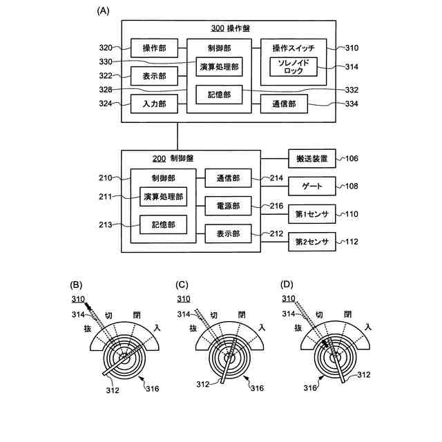鍵手段の抜き差しが可能な抜位置、前記駆動装置の動作を停止した状態にするための切位置、前記駆動装置の動作を可能な状態にするための入位置、及び、前記切位置と前記抜位置との間において前記鍵手段の回転を制限する回転制御手段を含む鍵操作スイッチ、並びに、前記ゲートの閉扉を受付ける手段、を備える操作盤と、