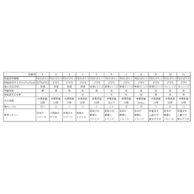 即席食品に使用されている乾燥食材の主な課題であるサイズ及び食感には、課題が生じる明確な背景が存在する。乾燥食材に熱湯をかけて短時間で湯戻しするためには、乾燥食材中の細かい空隙に熱湯が短時間で隈なく浸透する必要があるが、乾燥食材のサイズが大きいと、中心部まで熱湯が浸透するのに時間を要してしまうため、サイズを小さくせざるを得ない。そのため、食材の食べ応えはどうしても低下し、満足感の得られる食事にはならない。また、乾燥食材の中心部まで熱湯が浸透したとしても、乾燥食材中には無数の細かい空隙が存在しており、その全ての空隙を水分子で満たすことは困難であり、水分子で満たされた穴と空気が入った穴が混在した状態になるため、スポンジのような食感になる。例えば、なすの味噌汁を調理する場合、生のなすを鍋で長時間煮込んだ場合、調理後のなすは鍋の底に沈むが、フリーズドライの味噌汁のなすは、熱湯を注いで推奨される時間が経過しても液面に浮いている。これは、前者はなすの中に空気が入った穴はほとんど存在していないため沈み、後者は空気の入った穴が多く残っているため液面に浮くものと考えられる。従って、乾燥食材を用いた即席食品であっても、乾燥食材中の無数の細かい空隙に、隈なく水分子を浸透させる技術を確立することができれば、生食材を長時間鍋で煮込んだような優れた食感となり得る。また、短時間で乾燥食材の中心部まで水分子を浸透させる技術を確立することができれば、大型の乾燥食材を用いても、短時間で調理可能な即席食品を製造することが可能となる。
