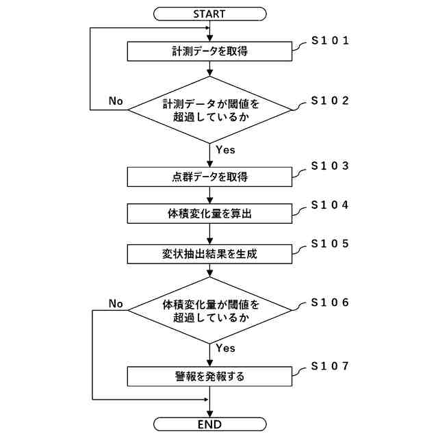 前記計測データおよび前記体積変化量に基づいて作成される変状結果データを学習させた学習済モデル生成し、前記学習済モデルを用いて前記計測データの閾値または前記体積変化量の閾値を推論する