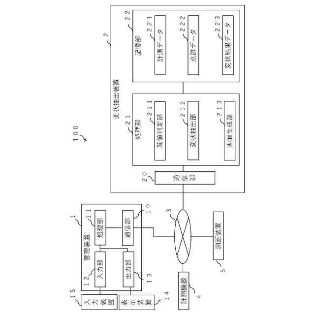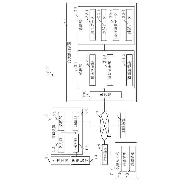 【解決手段】変状抽出装置2は、計測機器4によって取得された環境情報の計測データ221および測距装置5によって取得された対象物の点群データ222を取得する通信部20と、取得した計測データ221および点群データ222を記憶する記憶部22と、計測データ221および点群データ222に基づいて、対象物の点群データ222のうち少なくとも2つの点群データ222における体積変化量を算出し、算出した体積変化量が閾値を超過するか否かを判定する処理部21と、を備えるものである。