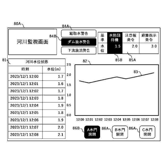 従来から、監視対象である河川管理施設で監視制御を行う監視システムが知られている。これらの監視システムは、河川における水量の増減を示した監視画面を提供し、ユーザは監視画面を確認したうえで必要に応じて施設に設置された装置を操作する。ユーザは、実際に現場に所在していなくても監視画面を通じて設備の状態を知ることが可能となる。