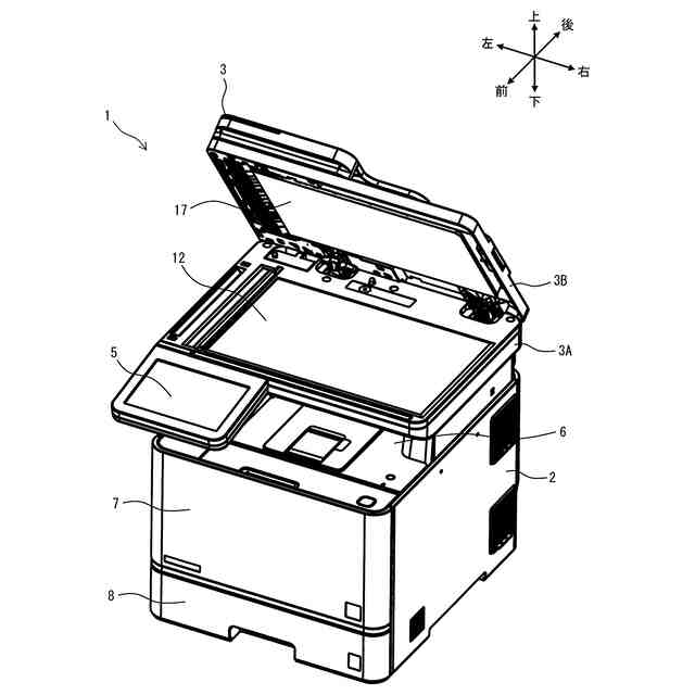 実施形態に係る複合機の自動原稿搬送部が開いた状態の外観構成の一例を表す斜視図である。