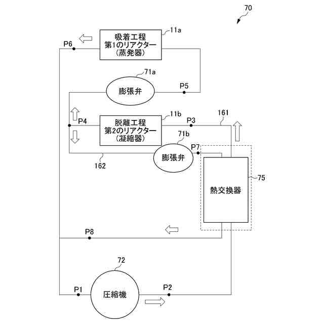(1)本発明は、吸着材(例えば、後述する吸着材12)を内部に有し、前記吸着材に対して二酸化炭素を含む気体を吸引して前記二酸化炭素を吸着させる吸着工程と、前記吸着材の周囲を減圧した状態で加熱することにより当該吸着材から前記二酸化炭素を脱離する脱離工程と、を実行する複数のリアクター(例えば、後述する第1のリアクター11a及び第2のリアクター11b)と、前記吸着工程を実行する前記リアクターに対して冷却のために供給される熱媒体を膨張して減圧する膨張弁(例えば、後述する膨張弁71、第1の膨張弁71a及び第2の膨張弁71b)と、前記脱離工程を実行する前記リアクターに対して加熱のために供給される前記熱媒体を圧縮して加圧する圧縮機(例えば、後述する圧縮機72)と、前記圧縮機で圧縮された前記熱媒体を冷却する熱交換器(例えば、後述する熱交換器75及び熱交換器75a)と、を備え、前記吸着工程を実行する前記リアクターに前記膨張弁で減圧された前記熱媒体を供給し、前記熱媒体と前記リアクターの間で熱交換を行って前記吸着材を冷却するとともに前記熱媒体を加熱し、前記圧縮機で圧縮された前記熱媒体を前記熱交換器によって冷却した上で前記脱離工程を実行する前記リアクターの前記吸着材を冷却する部分に供給し、前記熱媒体と前記リアクターの間で熱交換を行って前記吸着材を加熱するとともに前記熱媒体を冷却する、二酸化炭素回収装置(例えば、後述する二酸化炭素回収装置1)である。