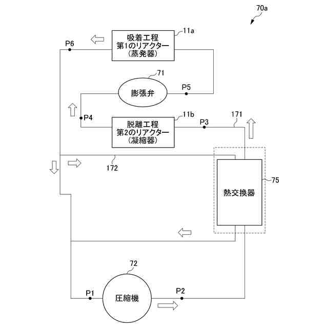 (3)上記(1)に記載の二酸化炭素回収装置において、前記熱交換器(例えば、後述する熱交換器75a)は、前記圧縮機によって圧縮された後であり前記脱離工程を実行する前記リアクターを通過する前の前記熱媒体と、前記リアクターの内部の前記熱媒体の流路(例えば、後述する流路76)を通過中の前記熱媒体と、の間で熱交換を行ってもよい。