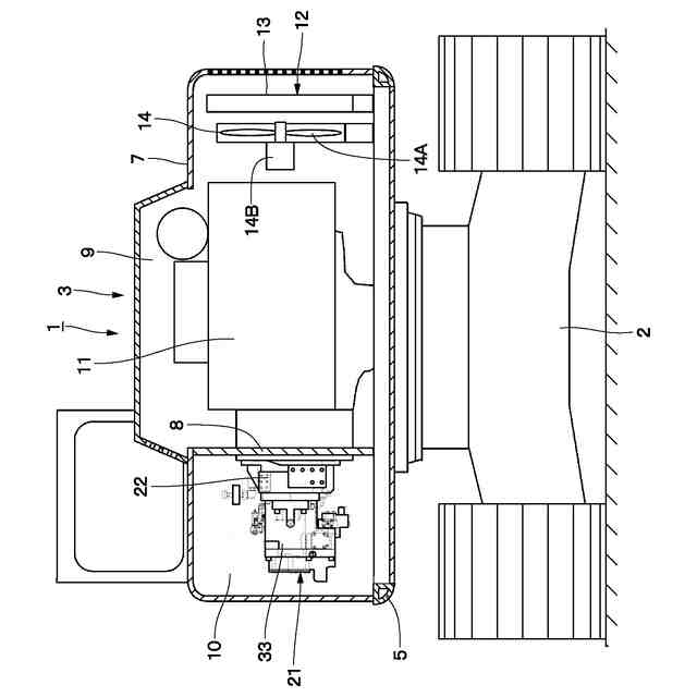 油圧ショベルの後部を図1中の矢示II-II方向から見た断面図である。