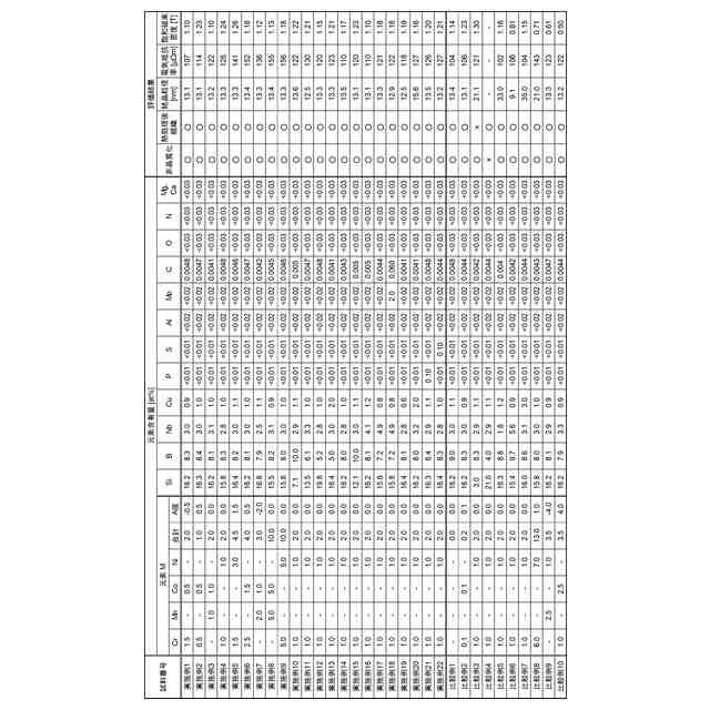 Fe-Si-B-Nb-Cu系合金においては、飽和磁束密度が高いこと、良好な軟磁気特性を有することなど、高い磁気特性を有することに加えて、高周波での渦電流損失を低減する等の観点から、高い電気抵抗を有することも、重要な特性となる。特に、高周波トランスやチョークコイルに用いられる場合に、サイズ低減の観点から、高い飽和磁束密度と、高い電気抵抗を両立することが望まれる。Fe-Si-B-Nb-Cu系合金を高電気抵抗化するには、Cr,Mn,Ni,Co等の高抵抗元素を添加することが考えられる。それらの元素の含有量を増やすほど、電気抵抗を向上させることができる。しかし、それらの元素を多量に添加すると、合金の磁気特性が低下しやすくなる。特に、Feの含有量が少なくなることで、飽和磁束密度の低下を招きやすい。このように、Fe-Si-B-Nb-Cu系合金において、高飽和磁束密度と高電気抵抗を両立することは、困難である。