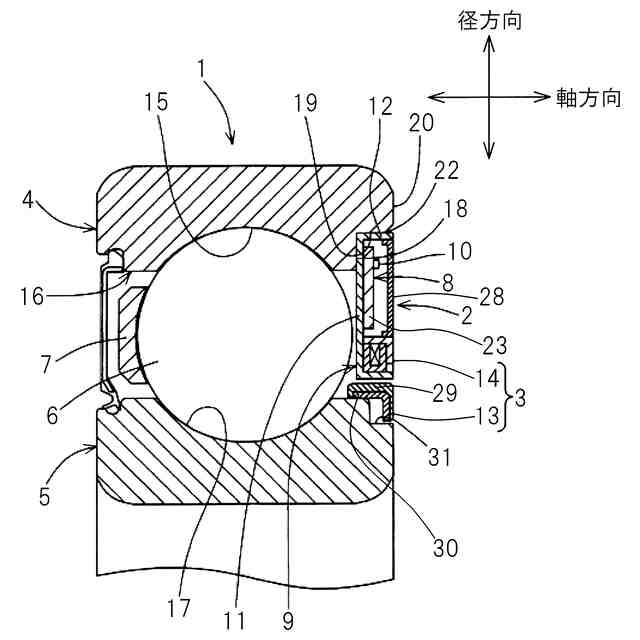 センサ付き軸受は、例えば内輪回転で用いられる軸受の一方端に発電機及び回路基板が配置される。軸受外輪には発電機のステータが固定され、ステータにはコイルが保持される。軸受内輪には発電機のロータとしてN極S極が交互に着磁された磁気リングが固定される。軸受の内外輪の相対回転に伴い、電磁誘導作用によりコイルに交流電圧が生成されることで、発電機で発電が行われる。発電部で発電した電力は例えば、軸受装置の各部で消費され、また蓄電部にも蓄えられうる。各回路やセンサ、無線等の通信デバイスを搭載する(電子)回路基板は、例えばステータを介して軸受外輪に固定され、さらに電子回路保護材で封止される。