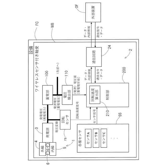 発電機で生成した交流電圧(電力)は電源回路へ入力される。電源回路によって、交流電圧を直流電圧へ整流し、その後、センサや電子部品の動作に必要な一定電圧を得る。センサは加速度センサや温度センサ等であり、一定電圧下で駆動させて軸受の状態である振動加速度や温度等の軸受に関する状態値のセンサ信号を得る。回転速度は発電機の出力の電圧変動(典型的には交流出力)を処理して得られる。例えば交流出力の交番周波数やピーク電圧から回転速度情報の取得が可能である。