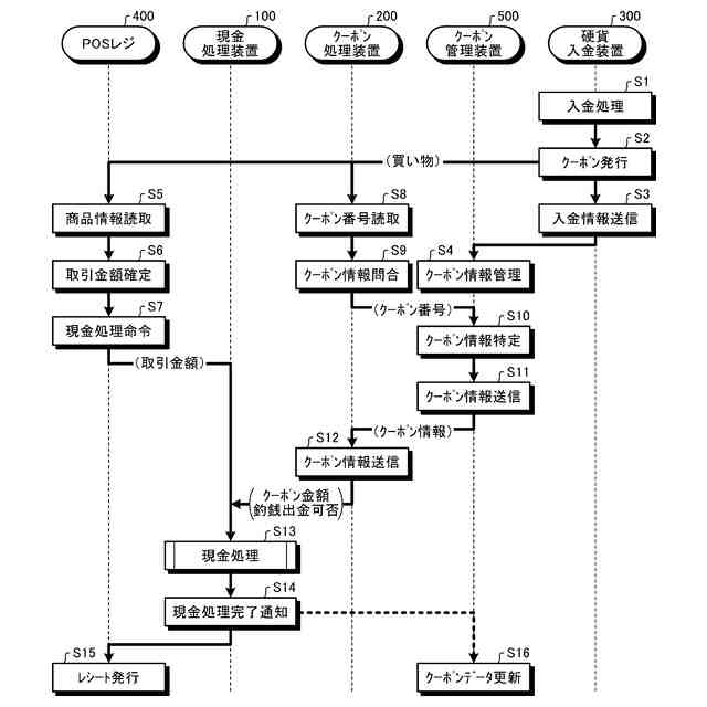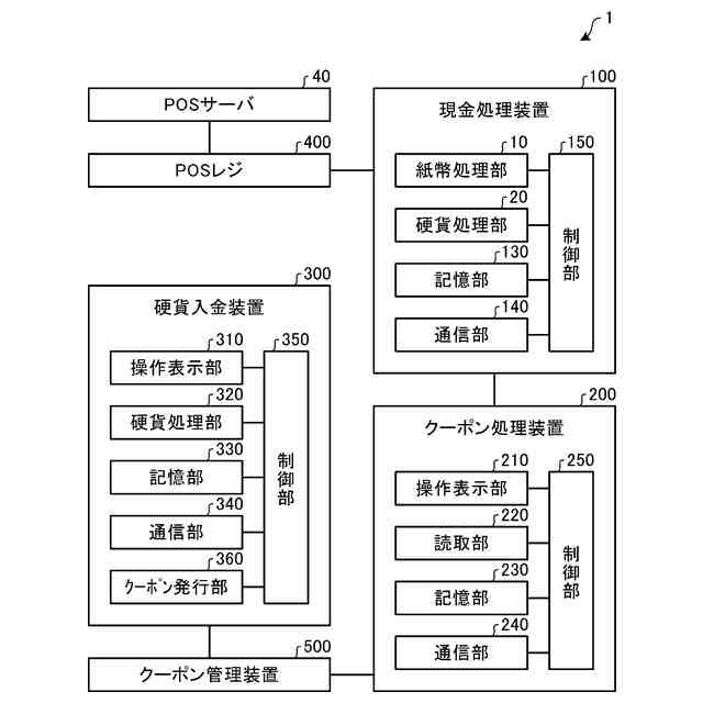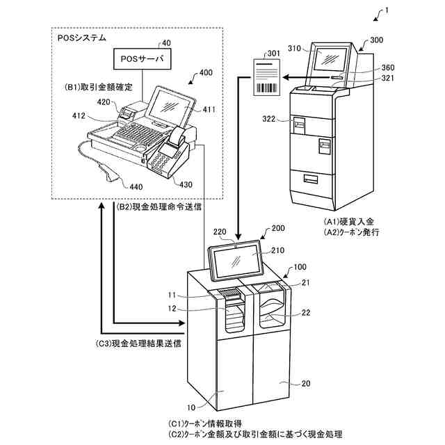 例えば、客から硬貨の入金を受け付けて、入金額に応じて取引金額の支払に使用可能なクーポンを発行する硬貨入金機が知られている。このクーポンを店舗で使用できるようにするには、商品券の場合と同様に、POSシステムの機能を更新する必要がある。システム更新の手間や費用の問題から、店舗は、クーポンを発行する新たな装置を容易に導入できないという問題があった。