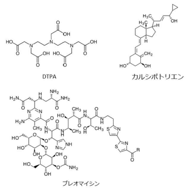 HepG2細胞およびHuH-7細胞において各10 μMのDTPA、カルシポトリエン、ブレオマイシンを処理した際の各種遺伝子発現の変化を示すグラフ。
