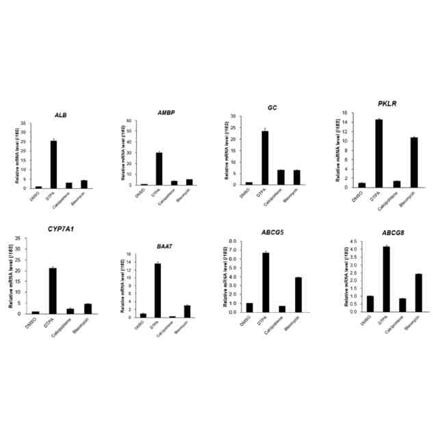 iHLO細胞においてDMSO、各10 μMのDTPA、カルシポトリエン、およびブレオマイシンを処理した際の各種遺伝子発現の変化を示すグラフ。