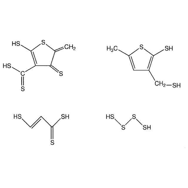本発明の実施例において、原料であるアクリル樹脂と硫黄に半経験的第一原理分子動力学計算を実施した後の化学構造式を示すものである。