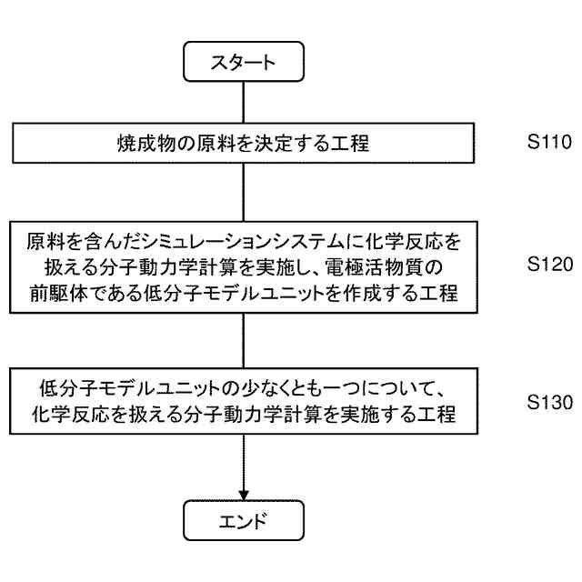 【解決手段】焼成を経て得られる炭素原子および硫黄原子を含む電極活物質の安定構造モデルを、低分子モデルユニットに対して焼成下で進行する化学反応をシミュレーションすることにより作成するモデリング方法であって、(1)焼成物の原料を決定する工程、(2)前記原料を含んだシミュレーションシステムに化学反応を扱える分子動力学計算を実施し、前記電極活物質の前駆体である低分子モデルユニットを作成する工程、および、(3)前記低分子モデルユニットの少なくとも一つについて、化学反応を扱える分子動力学計算を実施する工程を含む、モデリング方法。