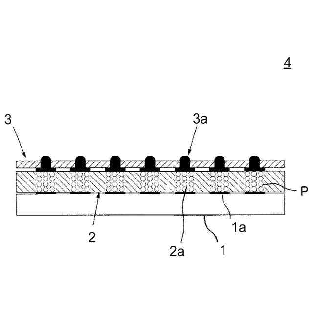 例えば、ウエハに形成された集積回路を検査するためのプローブカードとして、複数の検査用電極1aを有する接続基板1と、導電性粒子Pで構成された複数の導電部2aを有する異方導電性シート2と、複数の導電部3aを有するシート状プローブ3とを有するプローブカード4が提案されている(例えば特許文献1及び図1参照)。