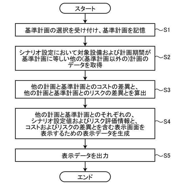 対象設備への複数の投資計画のうちの1つである基準計画と前記基準計画以外の1つ以上の前記投資計画である比較対象計画とのそれぞれに対応する投資シミュレーションによって求められるリスクおよびコストを用いて、前記比較対象計画ごとに、前記リスクおよび前記コストのそれぞれに関して前記比較対象計画と前記基準計画との差異を算出するステップと、