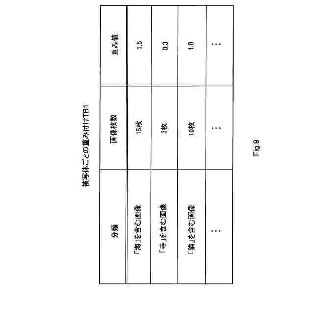 実施例1の変形例1に係るサーバ装置に記憶された被写体ごとの重み付けを示す表である。
