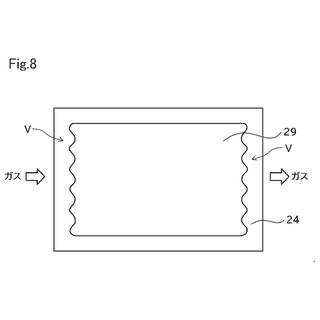 (4)上記(1)から(3)までのいずれか一項に記載の固体酸化物形電解セルにおいて、前記凹凸部が、酸素を含むガスの流れに対し、少なくとも上流側の1辺に存在してもよい。この形態の固体酸化物形電解セルによれば、空気極の周縁へのクラックの発生を効率的に抑制することができる。