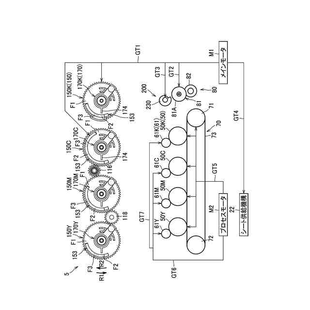 カムフォロワは、回転カムの回転に応じて回転カムの回転軸線方向に移動する。カムフォロワは、現像ローラを接触位置に位置させる非押圧位置と、現像カートリッジを押圧して現像ローラを離間位置に位置させる押圧位置と、現像カートリッジを押圧して現像ローラを第2離間位置に位置させる第2押圧位置との間で移動可能である。