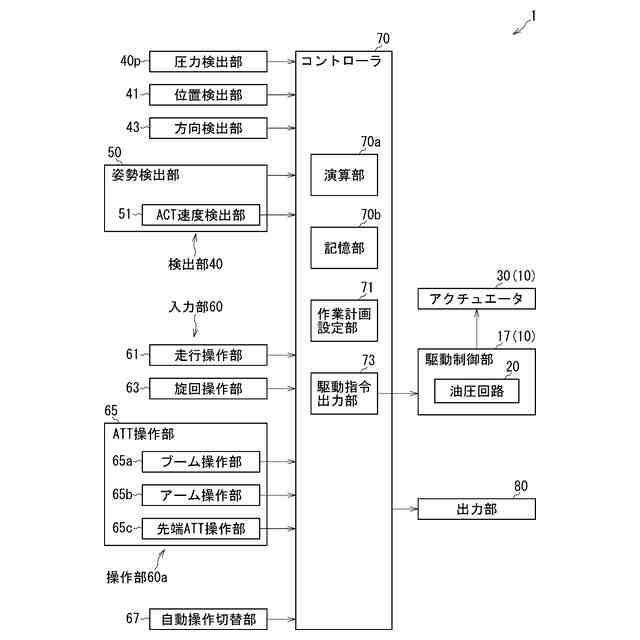 操作アシスト制御システム1は、図1に示す作業機械10の操作をアシストするシステムである。操作アシスト制御システム1は、作業機械10と、図2に示すように、検出部40と、入力部60と、コントローラ70と、出力部80と、を備える。
