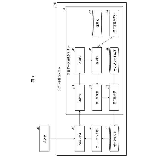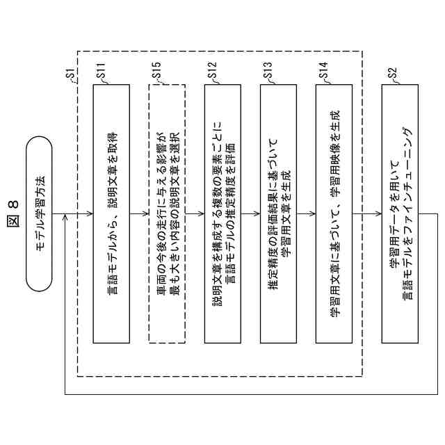 また、本発明の他の態様に係る学習データ生成方法は、コンピュータが、車両に搭載されるカメラが撮影して得られた撮影映像が入力されると、当該車両の状況を説明する所定書式の説明文章を出力する言語モデルから、前記説明文章を取得する取得ステップと、コンピュータが、前記説明文章を構成する複数の要素ごとに、前記言語モデルの推定精度を評価する評価ステップと、コンピュータが、前記推定精度の評価結果に基づいて、前記言語モデルに学習させるための学習用文章を生成する第一生成ステップと、コンピュータが、前記学習用文章に基づいて、前記学習用文章とともに前記言語モデルに学習させるための、前記学習用文章の内容を示す学習用映像を生成する第二生成ステップと、を含む。