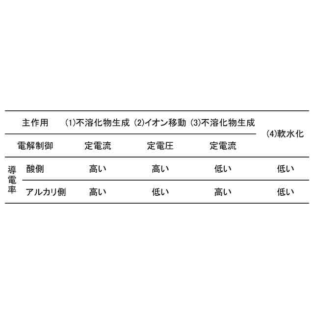 【解決手段】水処理装置1は、陽極12を備える陽極室15と、陰極13を備える陰極室16と、陽極室と陰極室とを仕切り、イオンを透過可能な膜14とを備え、電気分解により被処理水から酸性水とアルカリ性水とを生成する電解槽10を備える。水処理装置は、さらに、陽極室に流通する水の導電率を測定する第1の導電率測定部70と、陰極室に流通する水の導電率を測定する第2の導電率測定部80と、陽極と陰極との間の電圧又は電流を制御する制御部100とを備える。陽極室は酸性水が流通し、陰極室はアルカリ性水が流通する。制御部は、第1の導電率測定部により測定された水の導電率及び第2の導電率測定部により測定された水の導電率の少なくとも一方に基づき、定電流制御と定電圧制御とを繰り返す電解制御を終了する時間を決める。