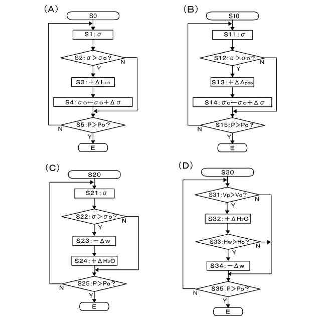 上記の構成に於いて、「光触媒物質」は、上記の如く、光を照射されると、水の分解反応を惹起して、水を還元して水素ガスを発生することのできる物質であってよい。「光触媒体」は、かかる光触媒物質から成り、水中に分散される粒子、或いは、光触媒物質そのもので形成された部材又は任意の基板又は基質上に光触媒物質を固定してなり、水中の任意の位置に配置されたもの、若しくは、それらの両方であってよい(以下、本明細書に於いて、単に「光触媒」という場合には、光触媒物質を指すものとする。)。「光源装置」は、典型的には、電力の供給を受けて、光触媒物質に吸収されて水の分解反応を惹起させる光を発する任意の形式の装置であってよい。光源装置の発光波長は、光触媒へ照射される光が効率的に光触媒に吸収されて励起電子と正孔とを生成するように、好適には、光触媒の量子収率が(任意に選択されてよい)所定の閾値を超える波長帯域に入るように選択される。この点に関し、典型的な光触媒の量子収率は、照射光の波長が或る波長付近を下回ると急激に増大する。従って、光源の発光波長が、かかる光触媒の量子収率の急激な増大が生ずる波長よりも短波長側となるように、光源が選択されてよい。本発明に於いて利用可能な光触媒としては、例えば、SrTiO3(チタン酸ストロンチウム)、La2Ti2O7(チタン酸ランタン)、Ga2O3(酸化ガリウム)、GaN(窒化ガリウム)、NaTaO3(タンタル酸ナトリウム)、TiO2(酸化チタン)などが利用可能である。なお、これらの光触媒は、適宜、助触媒が付加されて使用されてよい。光源装置の発光素子としては、種々の発光ダイオード(LED)が採用されてよく、具体的には、インジウム窒化ガリウム(InGaN)、ダイヤモンド(紫外)、窒化ガリウム(GaN)/アルミニウム窒化ガリウム(AlGaN)(紫外、青)、セレン化亜鉛(青)、酸化亜鉛(近紫外、紫、青)を用いたものが利用可能である。「水純度検知手段」は、任意の手法で水の純度を検知する手段であってよい。具体的には、水純度検知手段は、水の電気伝導度を検出する手段であってよく、水の電気伝導度が所定の閾値を上回ると、水の純度が低下したと検知するよう構成されていてよい。「所定の閾値」は、有意な水素発生量の低下が生ずる純度に対応する電気伝導度であり、使用者により適宜設定されてよい。「水素発生量補償手段」は、水素発生量がそれまでよりも増大する任意の手法による作動を実行する手段であってよい。