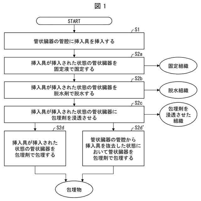 本発明の一態様によれば、管状臓器の固定組織、脱水組織、包埋剤が浸透した組織または包埋物を製造するにあたり、管腔部分の潰れを低減できる製造方法が提供される。
