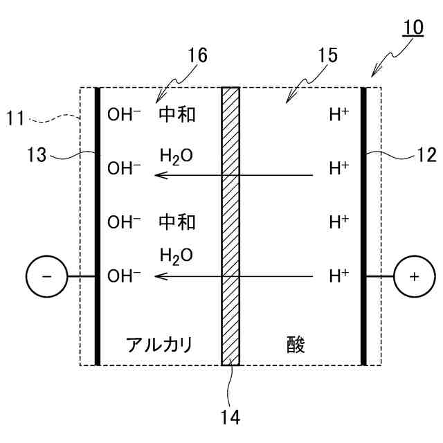 本実施形態に係る水処理装置の電解槽において、水素イオンの移動及び中和の状態を示す概略図である。