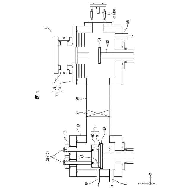 真空処理装置1は、ロードロック室10、中間室20、真空処理室30、搬送機構部40、および、真空処理装置1の各部を制御する制御部60を備えている。ロードロック室10と真空処理室30とは、中間室20を介して気密に接続されている。ロードロック室10、中間室20、真空処理室30は、X軸方向に並んで配置されている。