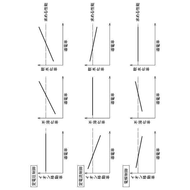 定電流制御のみを行った場合、定電圧制御のみを行った場合、電解制御を行った場合における、被処理水の導電率と、金属イオンのイオン移動率及び不溶化率並びに軟水化率との関係を概略的に示すグラフである。