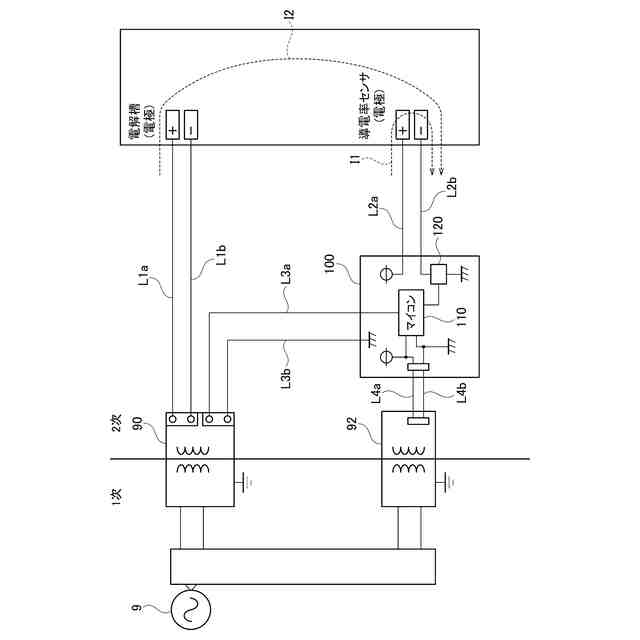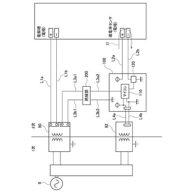 しかしながら、水処理装置において、電解槽の電源を制御する電源系統と、導電率を測定する導電率センサーの電源系統が電気的に接続される場合、電解槽の電極から導電率センサーの電極に対して電流の回り込みが発生する場合がある。電解槽の電極から導電率センサーの電極に対して、電流の回り込みが発生した場合、導電率センサーにおける導電率の測定に誤差が生じる場合がある。