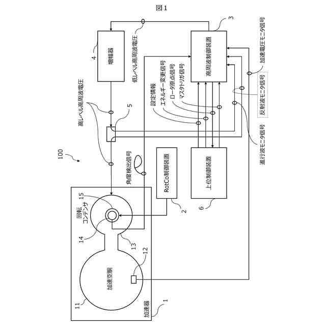 加速用高周波電圧は、加速用高周波電圧を励起する加速空胴と接続された変調器を用いて加速空胴の共振周波数を変調する。変調器として、例えば、回転コンデンサが挙げられる。回転コンデンサは、コンデンサを構成する電極が等速回転することで、加速空胴の共振周波数を変化させる。この共振周波数の変化に追従した高周波電圧を加速空胴に供給することで、荷電粒子ビームを安定に加速できる。