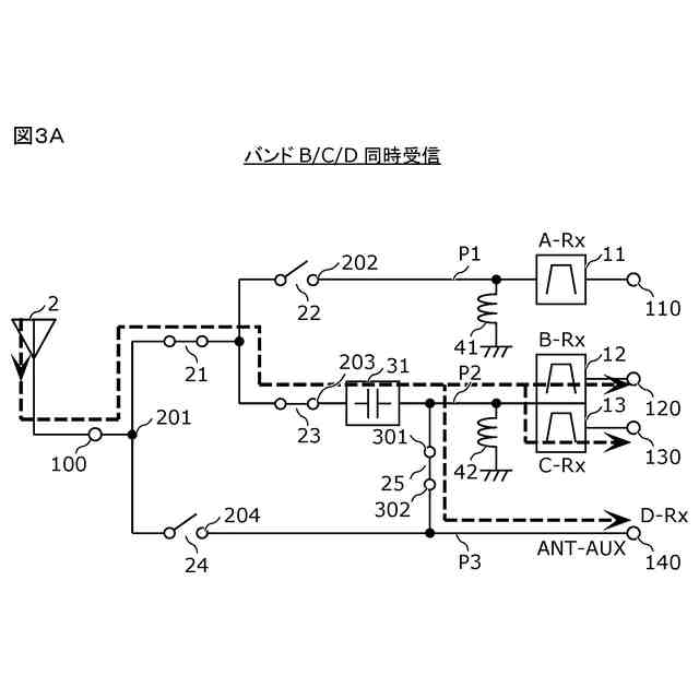特許文献1(図9)には、スイッチと、当該スイッチの各端子に接続された複数のフィルタと、を備えたフロントエンド回路が開示されている。上記フロントエンド回路は、異なるバンドの複数の信号を同時伝送(CA:Carrier Aggregation)することが可能な構成を有している。