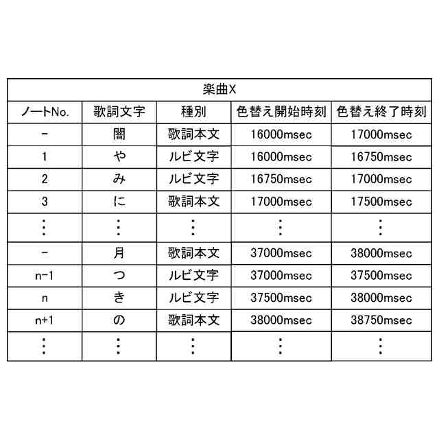 基準ピッチが最高ピッチから最低ピッチまでの範囲に含まれないと判定されたノートの発音開始時刻及び発音終了時刻と、当該ノートの基準ピッチと、当該ノートに対応する歌詞文字とを対応付けて記録したガイドボーカルタイミングデータを生成する生成部と、