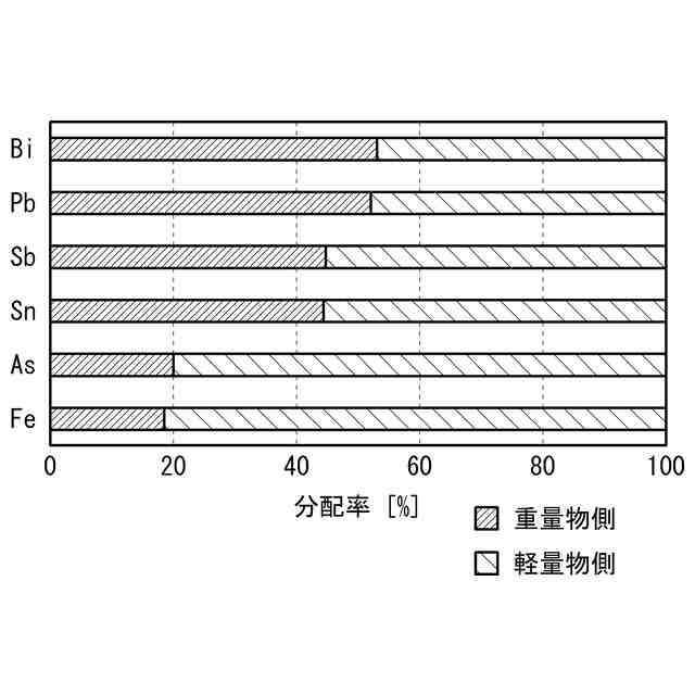 前記スパイスは、Pb、Sn、Sb、Biの少なくともいずれか1つを含み、前記スパイスに含まれるPb、Sn、Sb、Biの少なくともいずれか1つの濃度が、前記スパイスよりも前記重量物において高くてもよい。前記スパイスは、Fe、Asの少なくともいずれか1つを含み、前記スパイスに含まれるFe、Asの少なくともいずれか1つの濃度が、前記スパイスよりも前記軽量物において高くてもよい。前記分離工程において、比重選別機を用いてもよい。前記破砕工程において、凝固した前記スパイスを30mm以下の粒径になるように破砕してもよい。前記鉛原料は、銅製錬の過程で得られる鉛を含んでいてもよい。