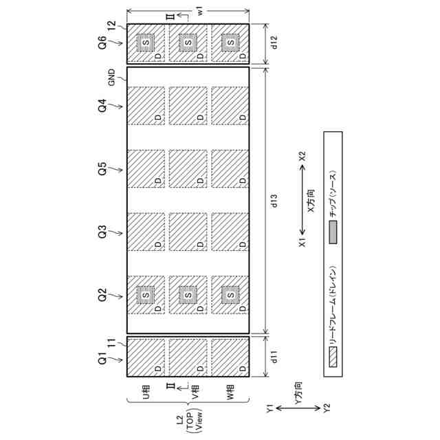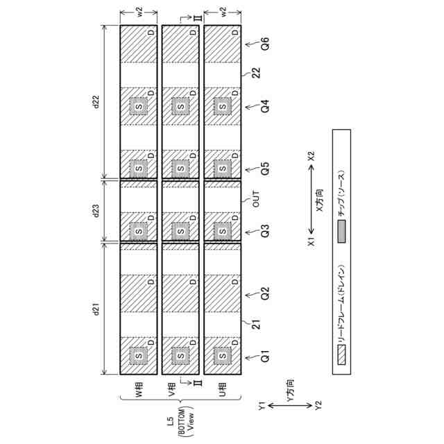 このように、第1配線層に対して、第1トランジスタの一方の面と第2トランジスタの他方の面を対向させて配置する、すなわち、第1トランジスタと第2トランジスタを反対向きに配置することで、第1トランジスタのソースと第2トランジスタのドレイン間を接続する第1配線を、短くかつ幅広にすることができる。これにより、配線インダクタンスを低減することができる。